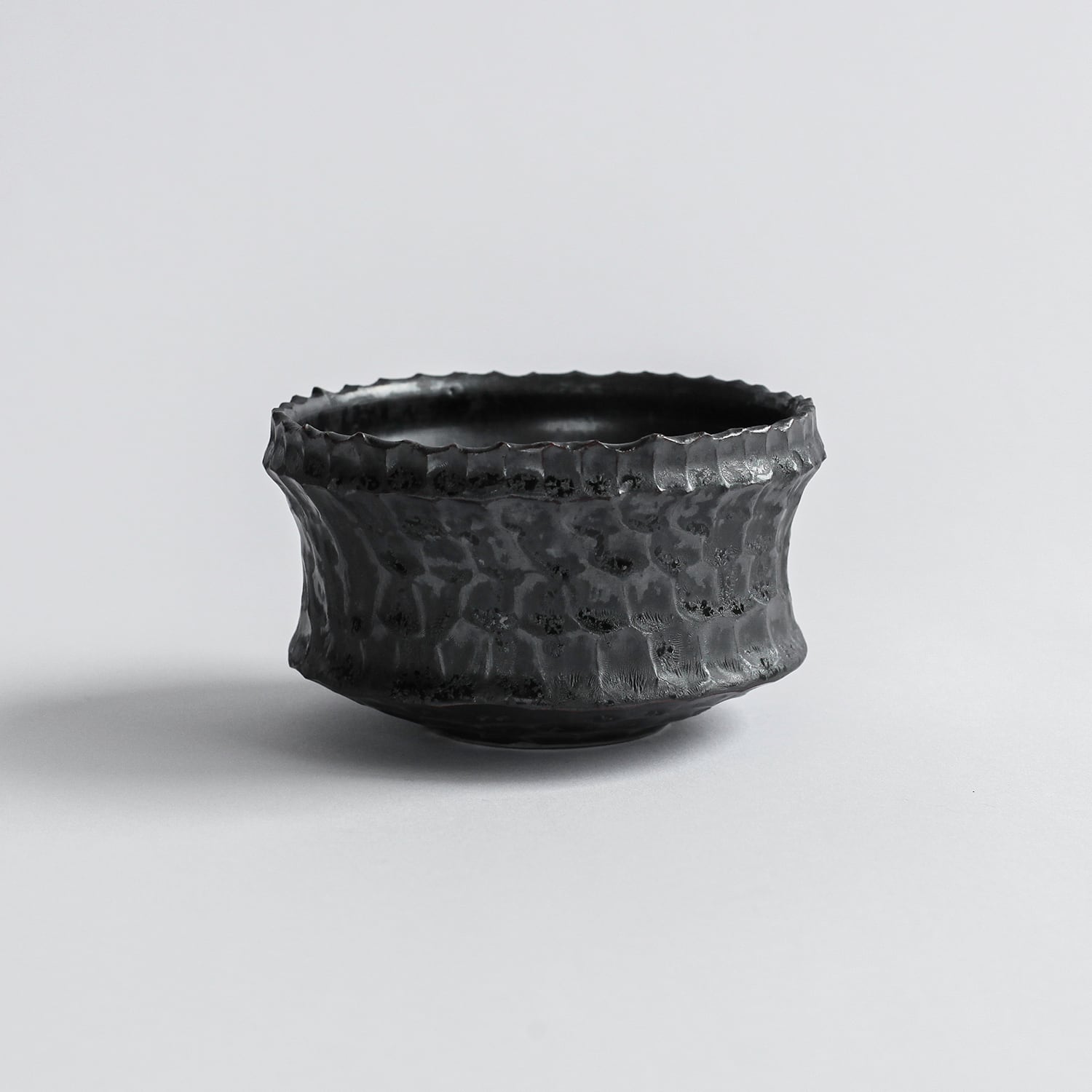 荒々しくも洗練された佇まい、不規則且つ大胆に施されたカッティング、文字に起こすと無骨で男性的な印象を与えるが、独自調合による金属釉(結晶とベンガラを用いた独特の質感)が塗布される事により都会的でモダンな印象に仕上がっております。