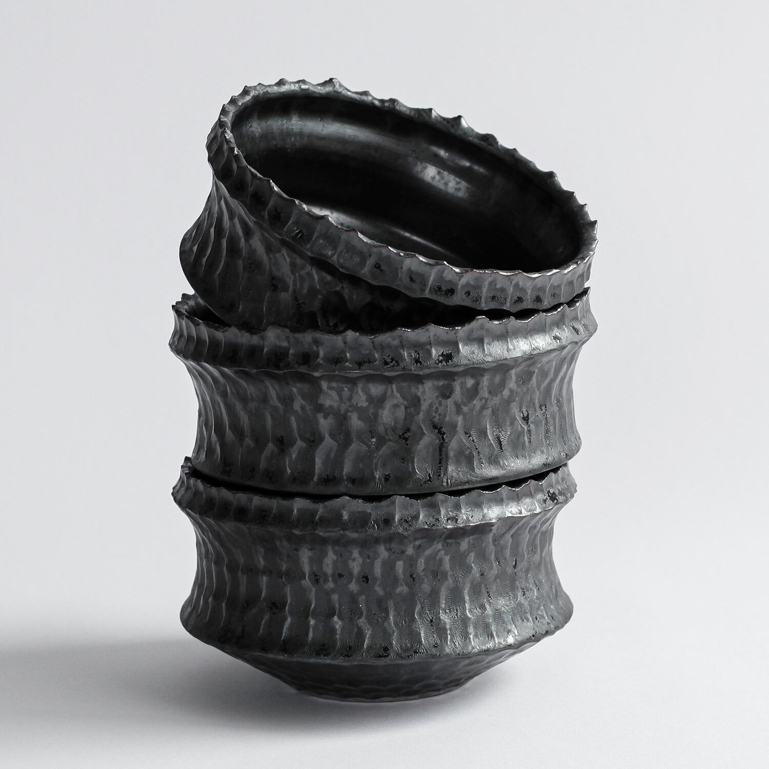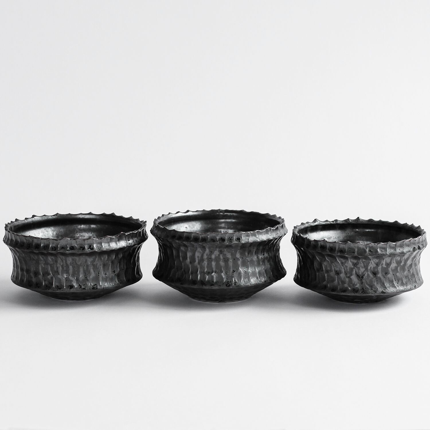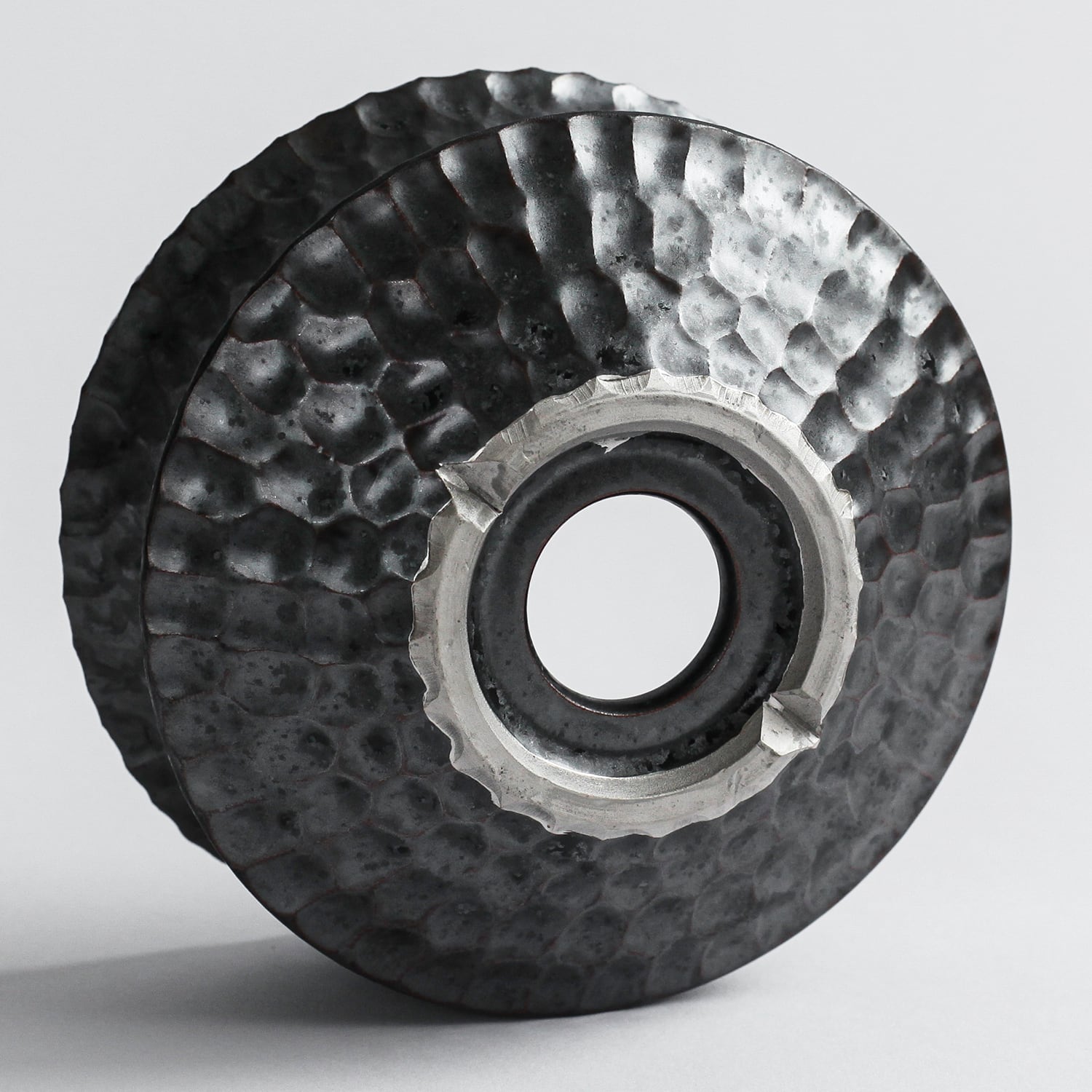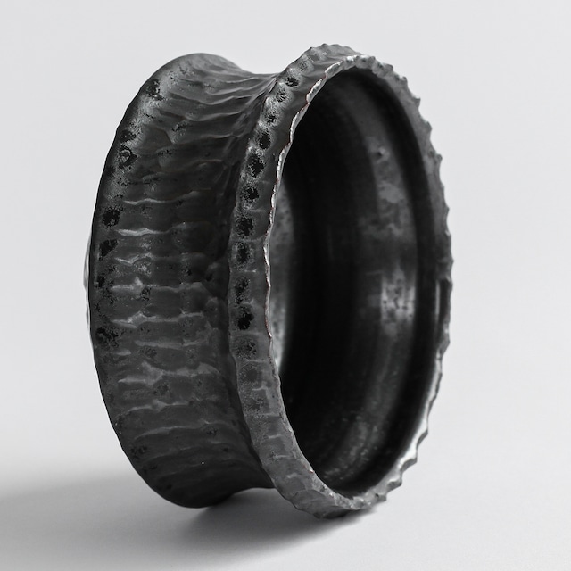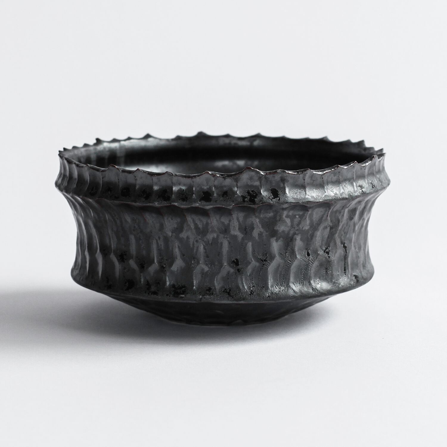 荒々しくも洗練された佇まい、不規則且つ大胆に施されたカッティング、文字に起こすと無骨で男性的な印象を与えるが、独自調合による金属釉(結晶とベンガラを用いた独特の質感)が塗布される事により都会的でモダンな印象に仕上がっております。