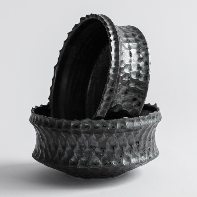 荒々しくも洗練された佇まい、不規則且つ大胆に施されたカッティング、文字に起こすと無骨で男性的な印象を与えるが、独自調合による金属釉(結晶とベンガラを用いた独特の質感)が塗布される事により都会的でモダンな印象に仕上がっております。