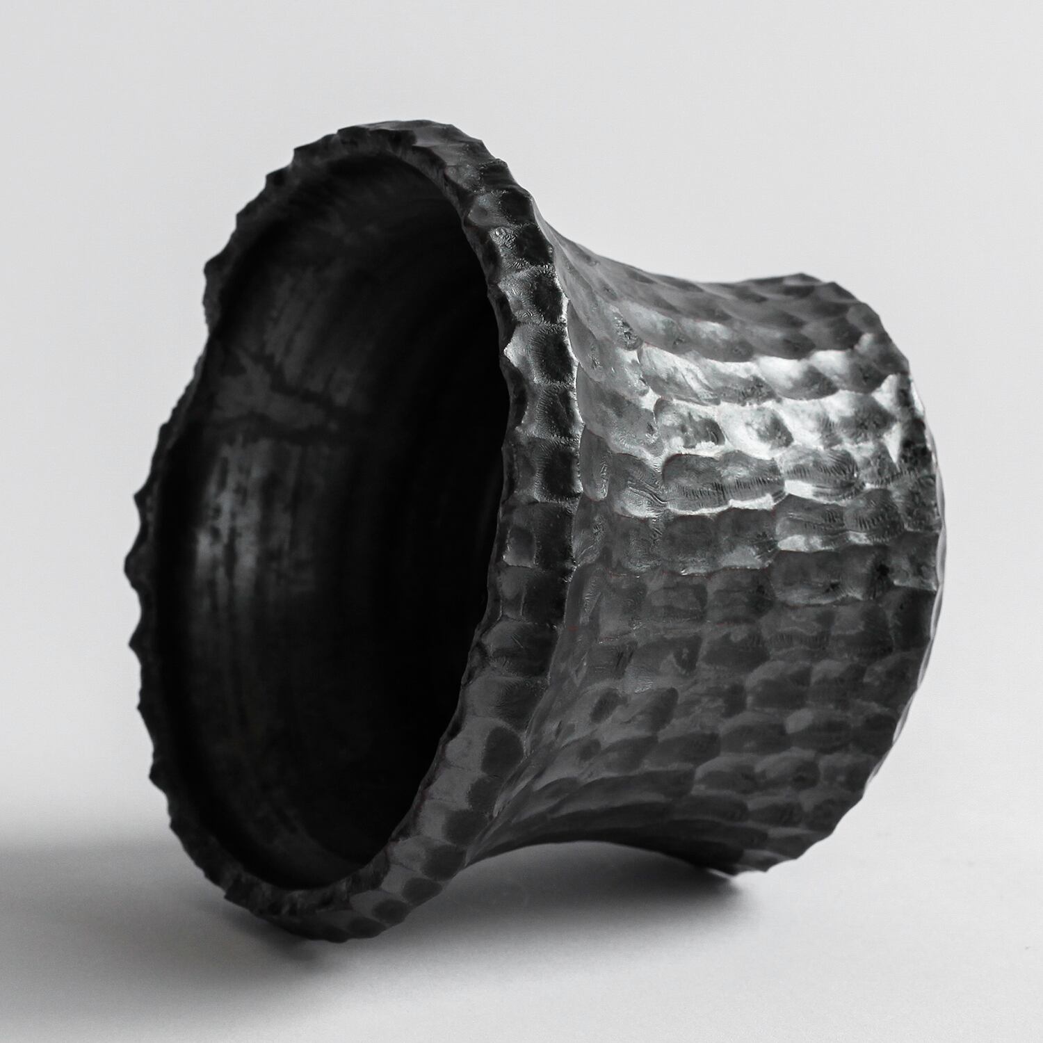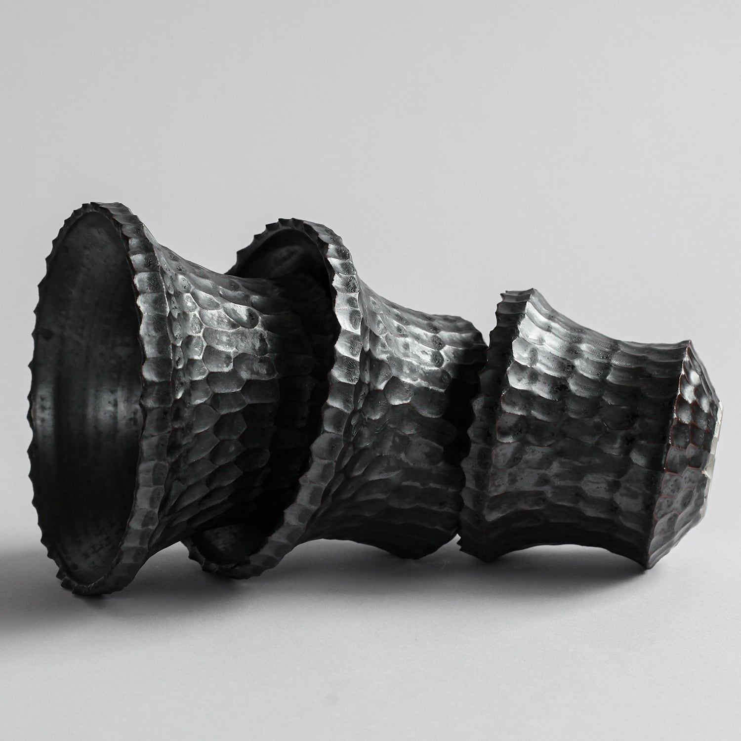 荒々しくも洗練された佇まい、不規則且つ大胆に施されたカッティング、文字に起こすと無骨で男性的な印象を与えるが、独自調合による金属釉(結晶とベンガラを用いた独特の質感)が塗布される事により都会的でモダンな印象に仕上がっております。