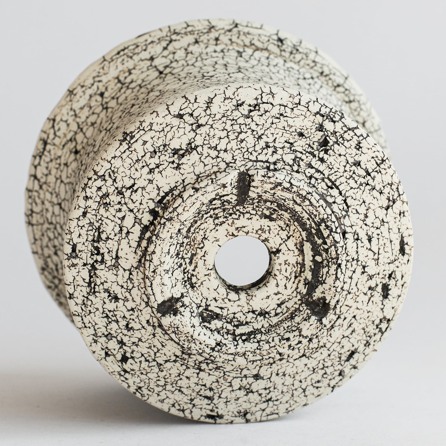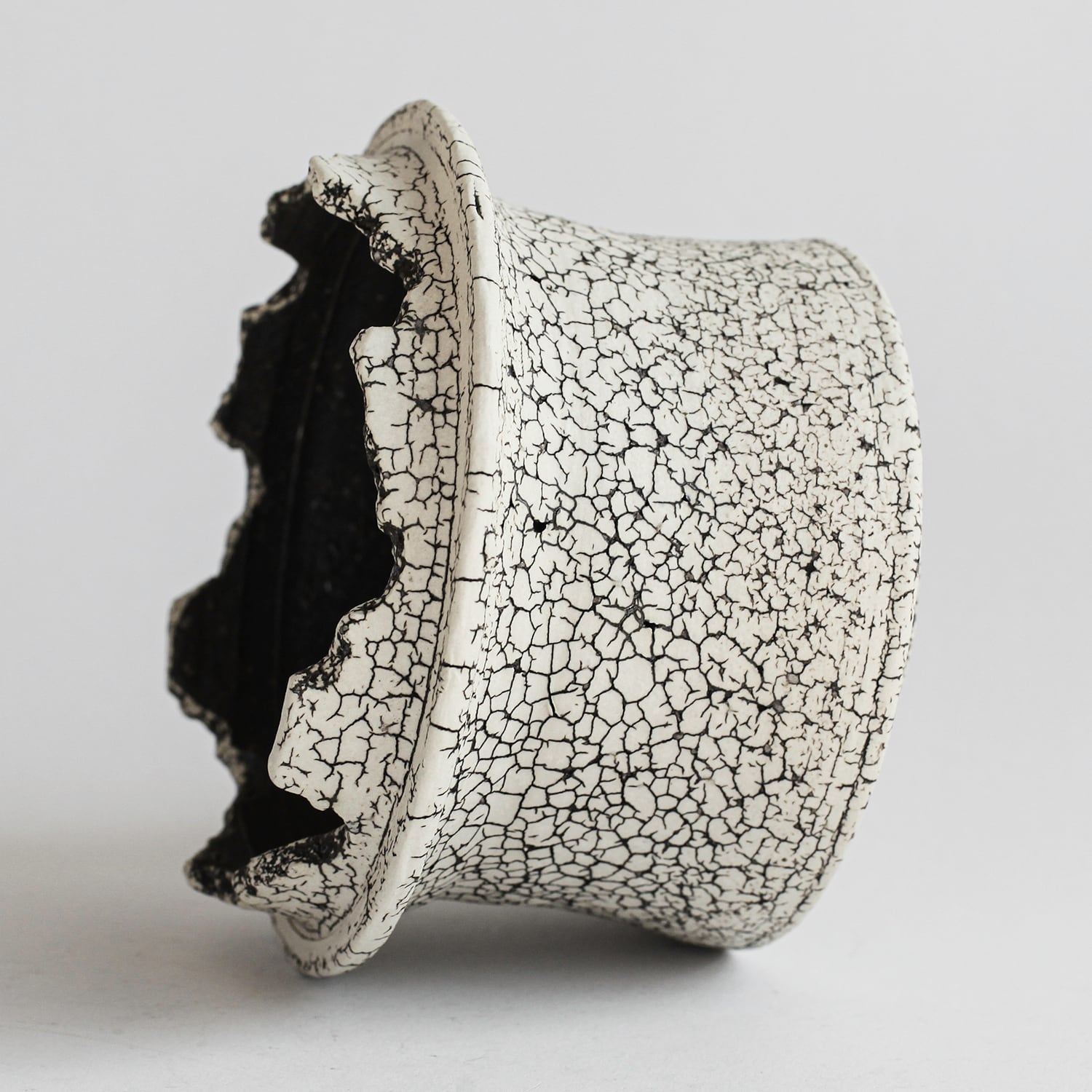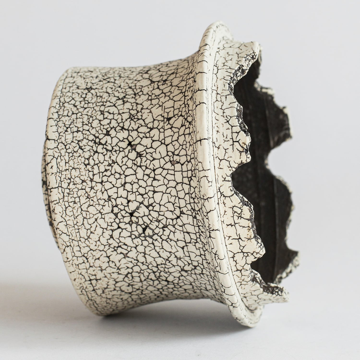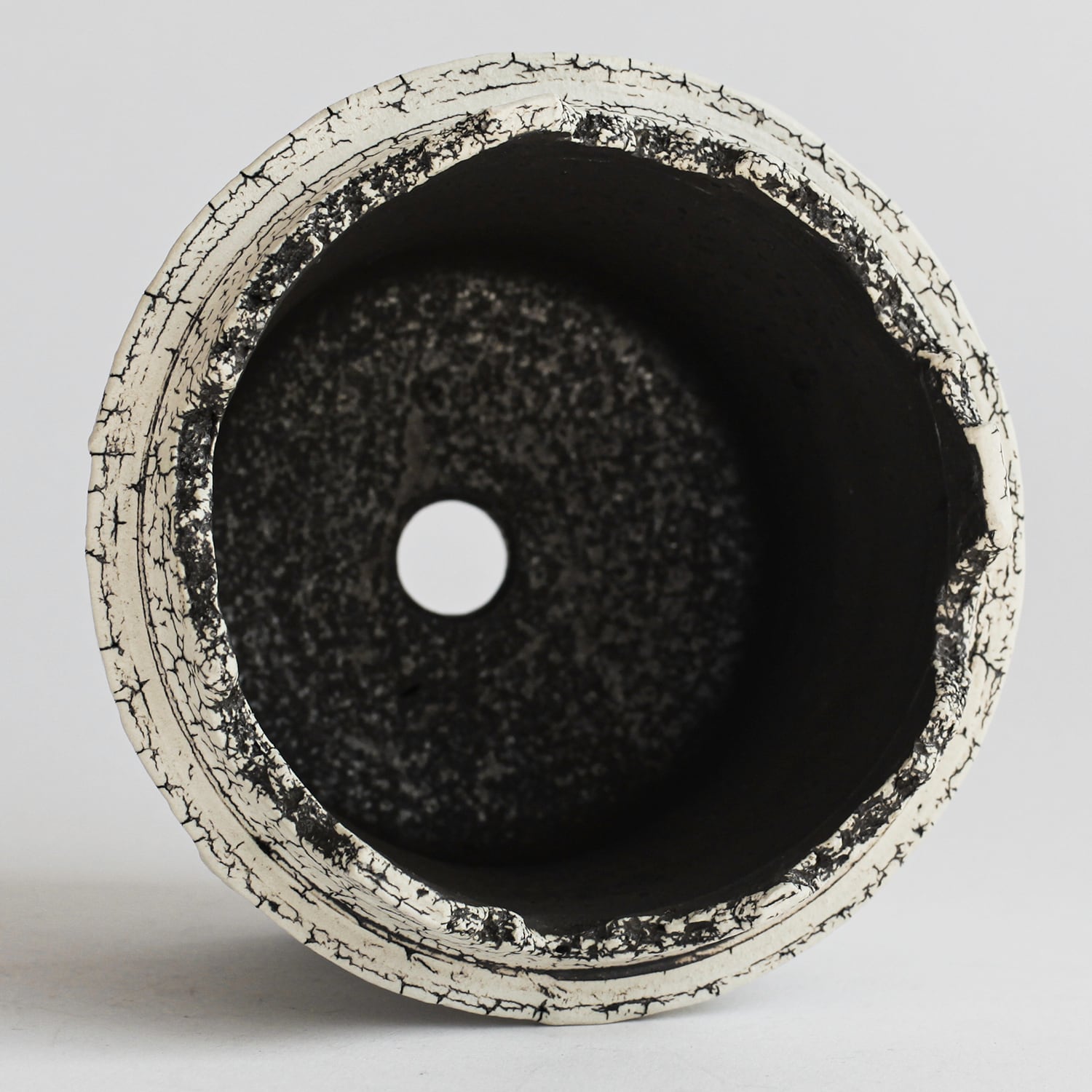 表面を覆っている罅のテクスチャは、本体の土と表面に薄くかけている白い土との焼成で伴う収縮率の違いにより生まれています。