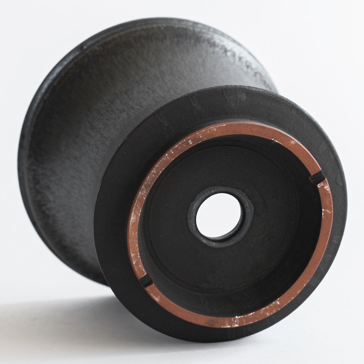 萩の陶芸作家、渋谷英一氏との試験的アプローチから偶発的に誕生した「Opus(オーパス)」シリーズ。陶芸作品的な柔和な膨らみそして曲線美、彫刻作品的な鋭敏な削りや彫りを一つの造形として成立させた作品群。