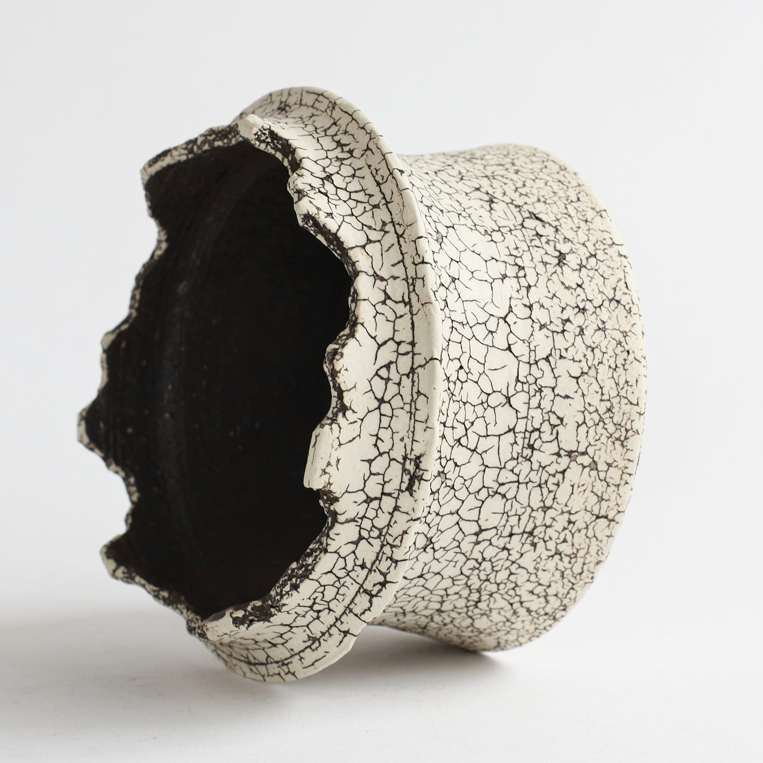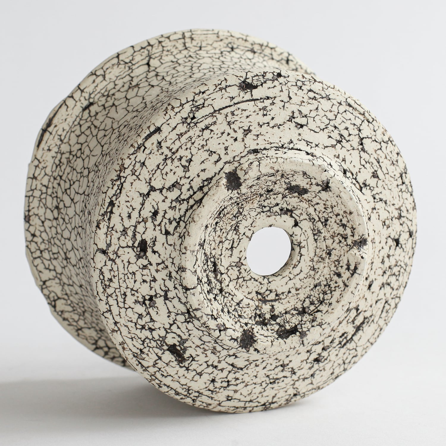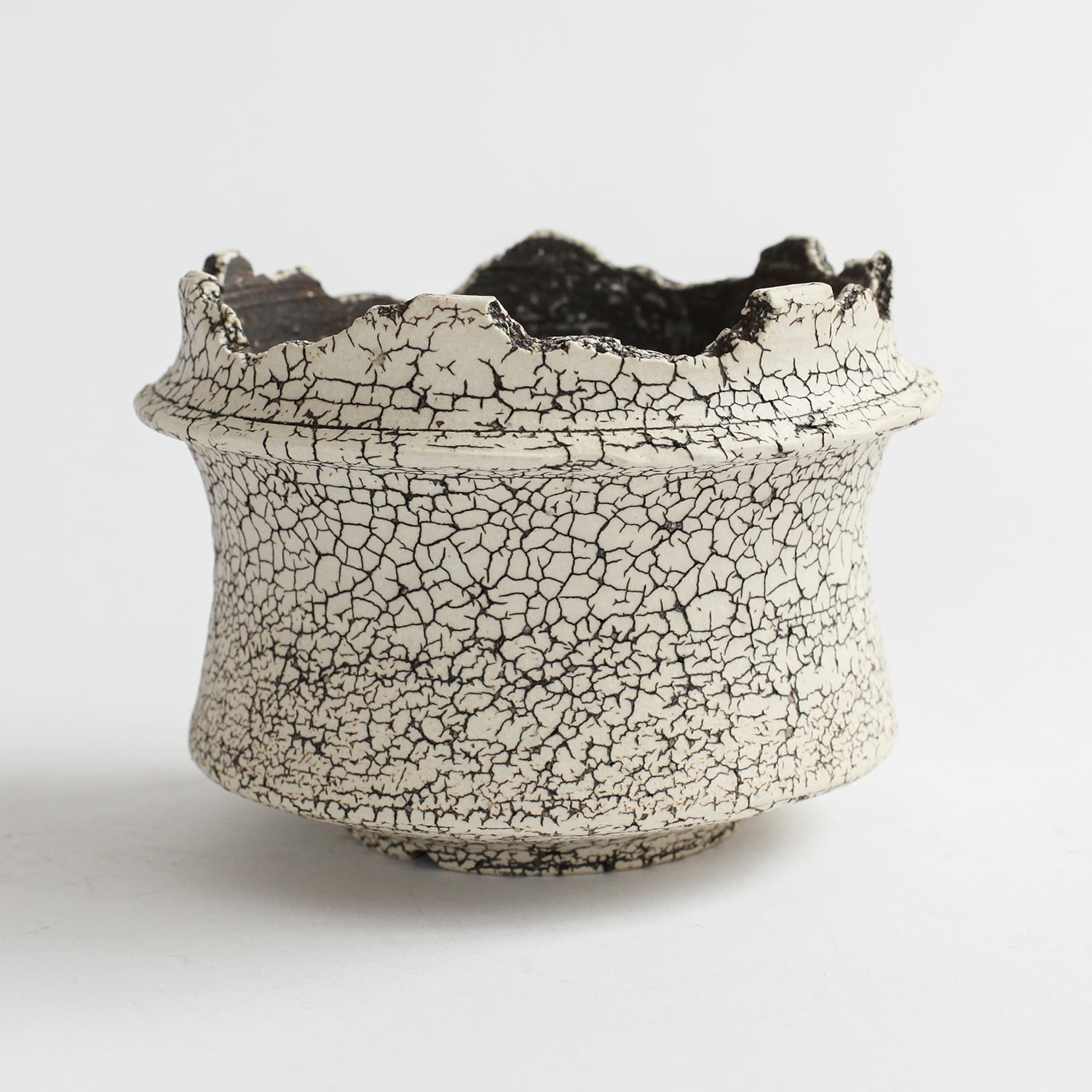 表面を覆っている罅のテクスチャは、本体の土と表面に薄くかけている白い土との焼成で伴う収縮率の違いにより生まれています。