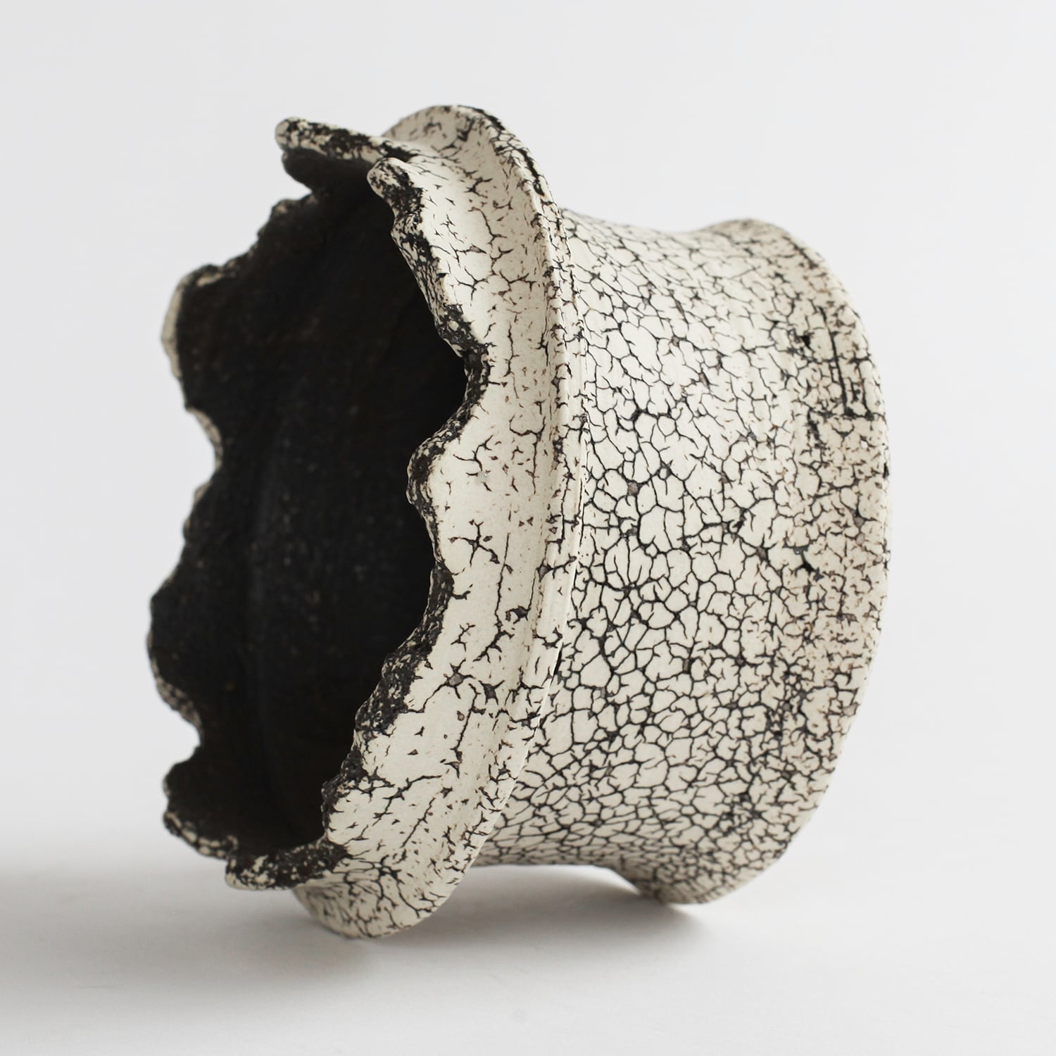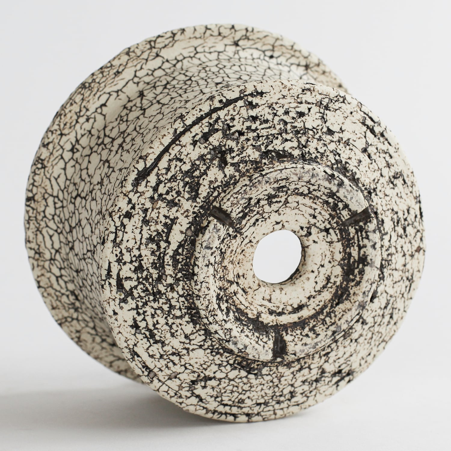 表面を覆っている罅のテクスチャは、本体の土と表面に薄くかけている白い土との焼成で伴う収縮率の違いにより生まれています。