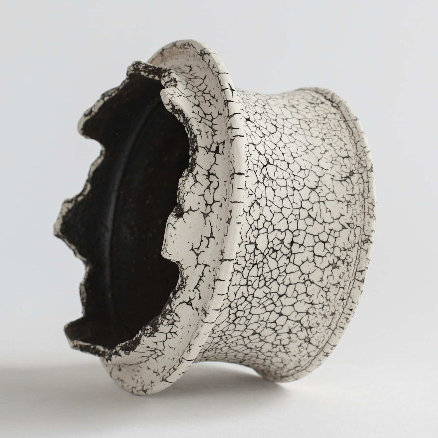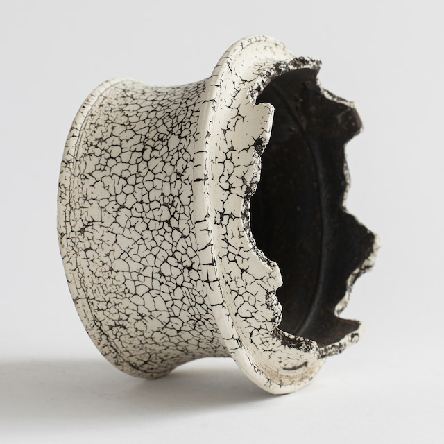 表面を覆っている罅のテクスチャは、本体の土と表面に薄くかけている白い土との焼成で伴う収縮率の違いにより生まれています。
