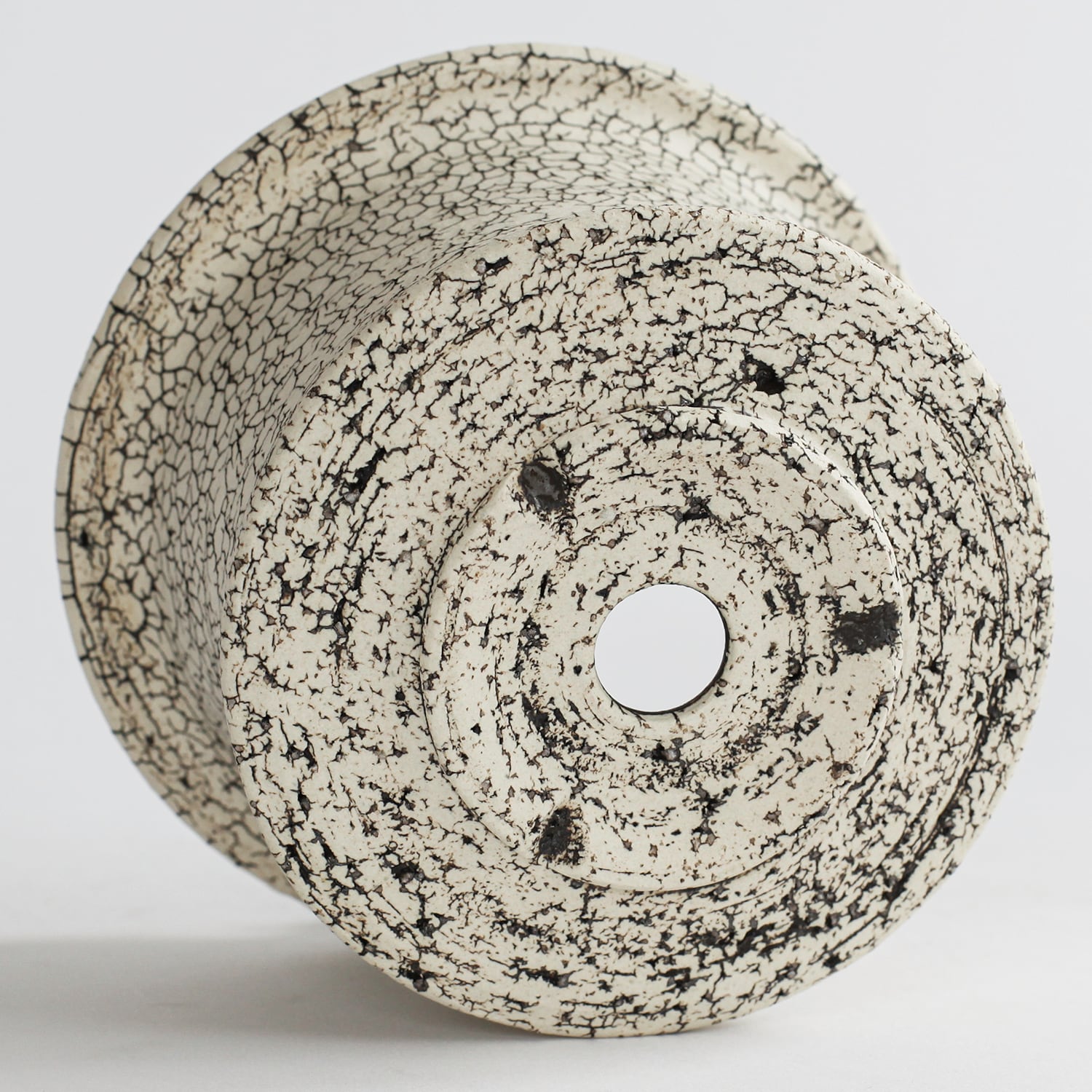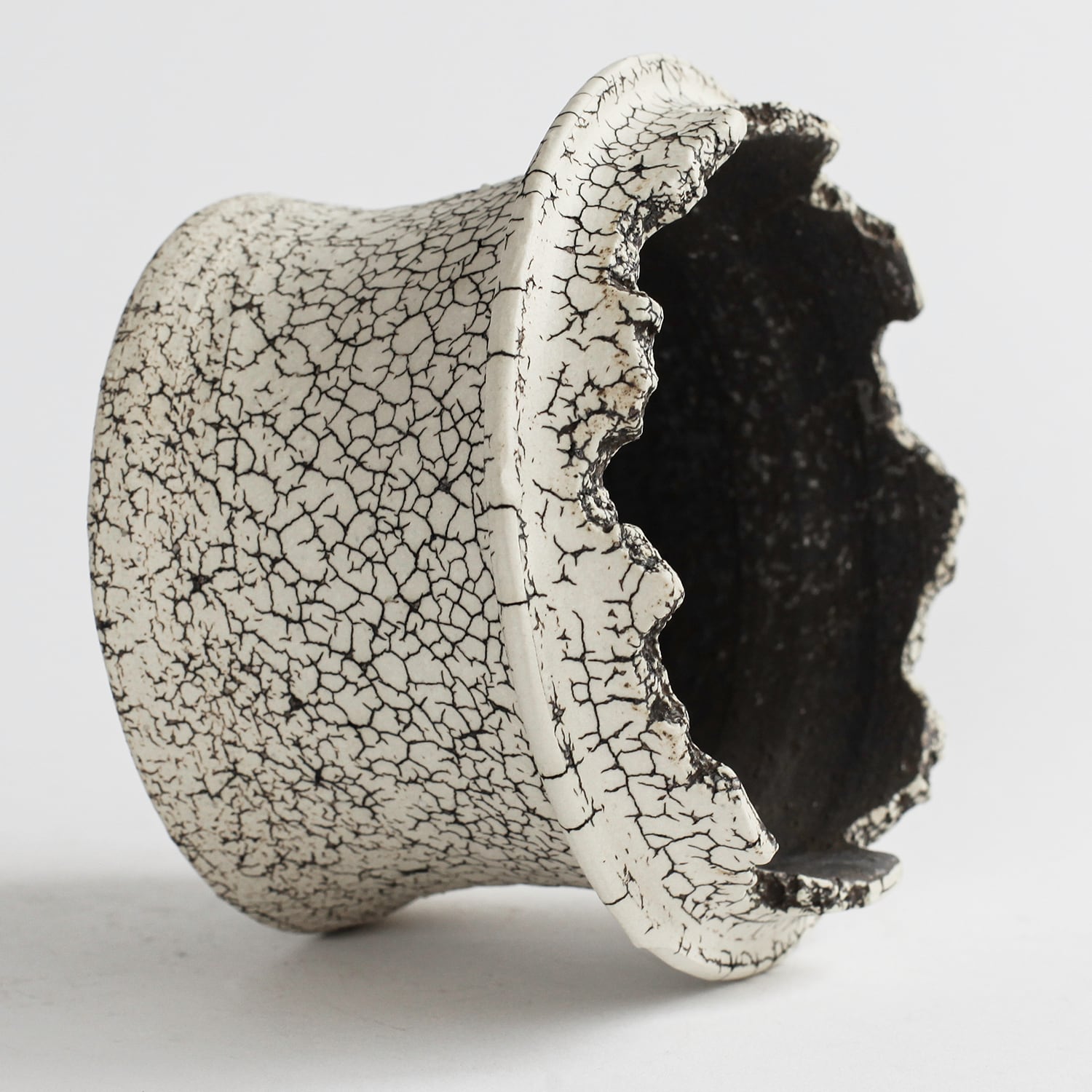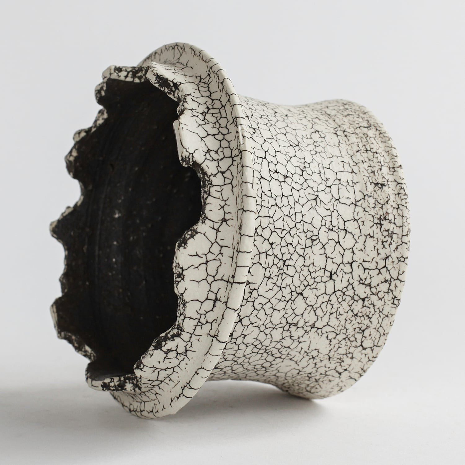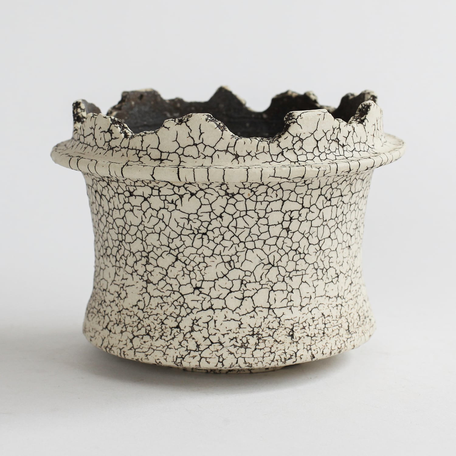 表面を覆っている罅のテクスチャは、本体の土と表面に薄くかけている白い土との焼成で伴う収縮率の違いにより生まれています。