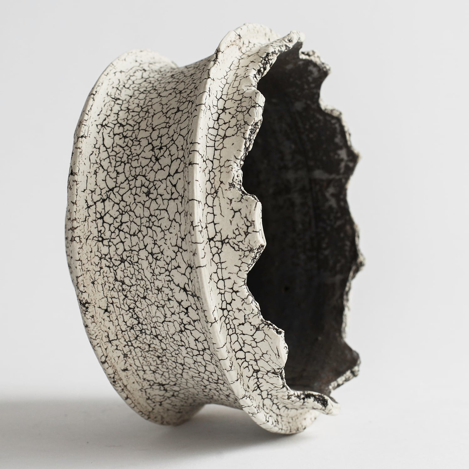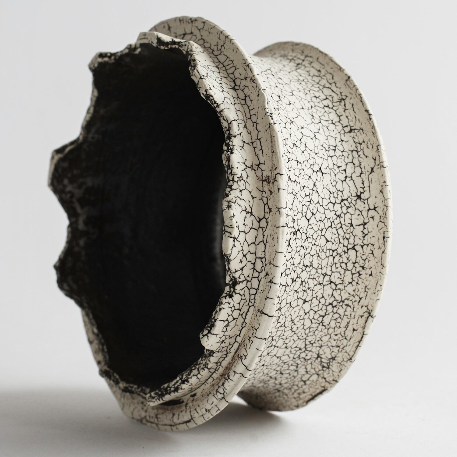 表面を覆っている罅のテクスチャは、本体の土と表面に薄くかけている白い土との焼成で伴う収縮率の違いにより生まれています。