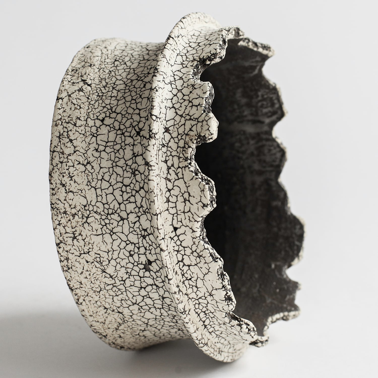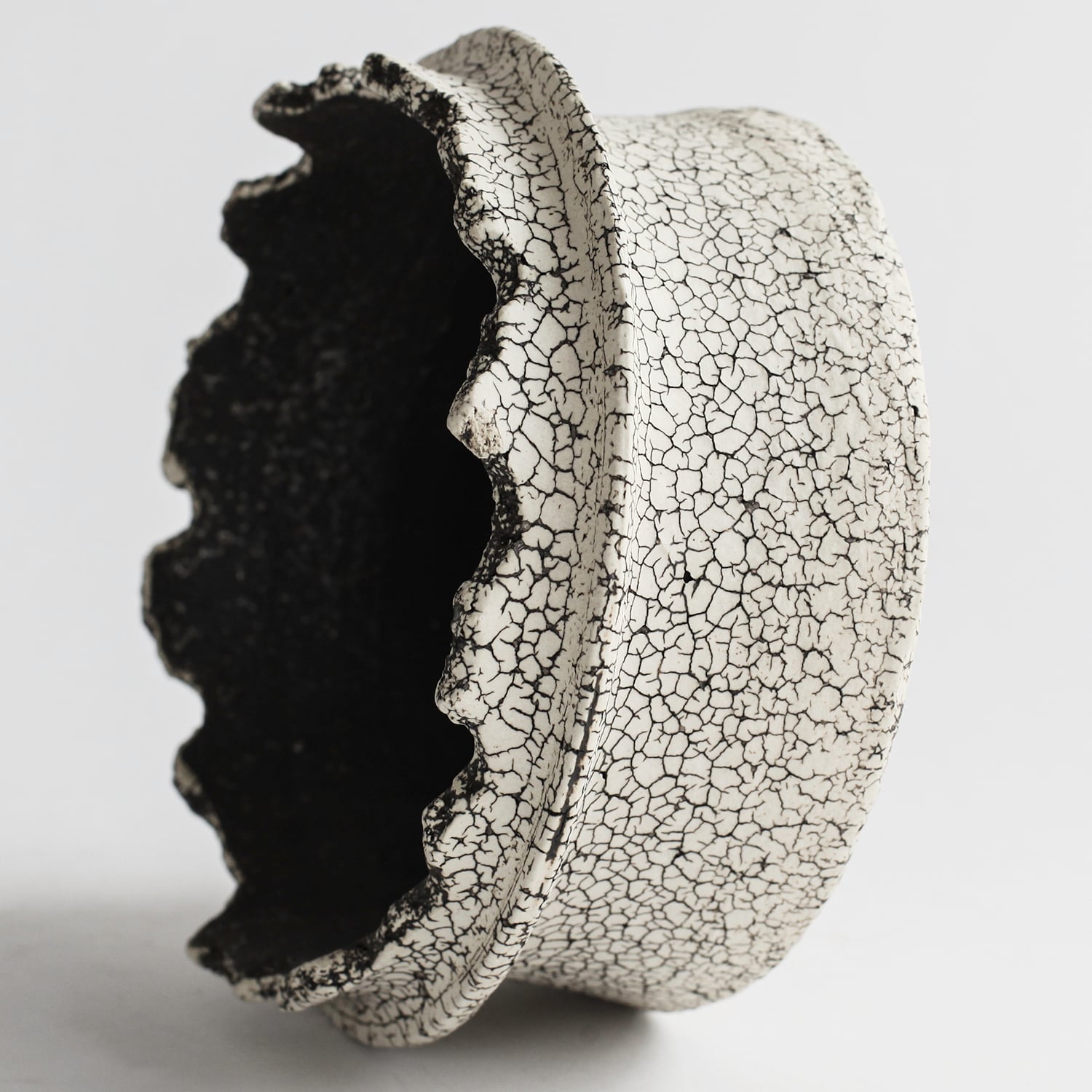表面を覆っている罅のテクスチャは、本体の土と表面に薄くかけている白い土との焼成で伴う収縮率の違いにより生まれています。