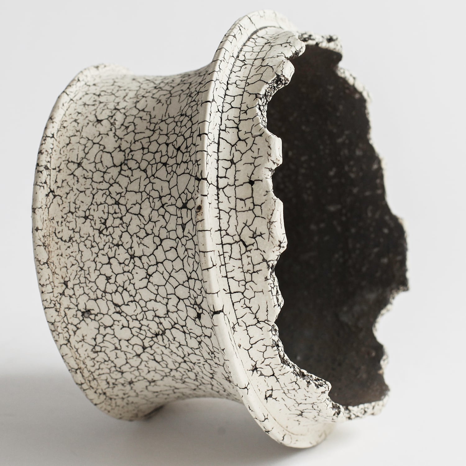 表面を覆っている罅のテクスチャは、本体の土と表面に薄くかけている白い土との焼成で伴う収縮率の違いにより生まれています。