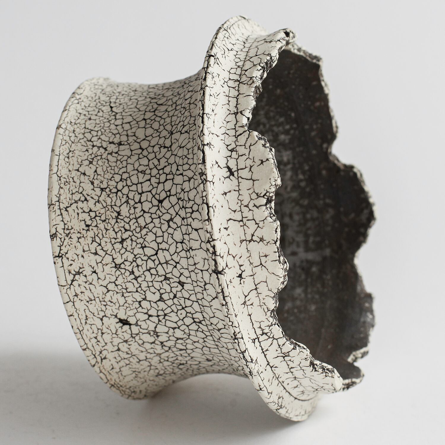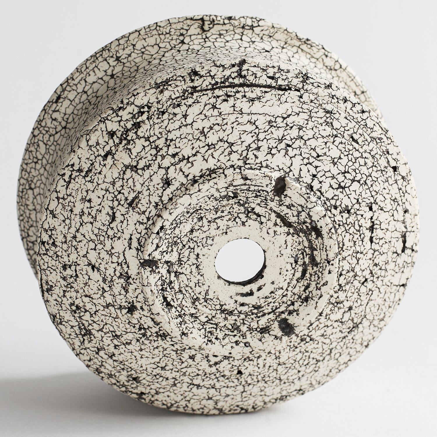 表面を覆っている罅のテクスチャは、本体の土と表面に薄くかけている白い土との焼成で伴う収縮率の違いにより生まれています。