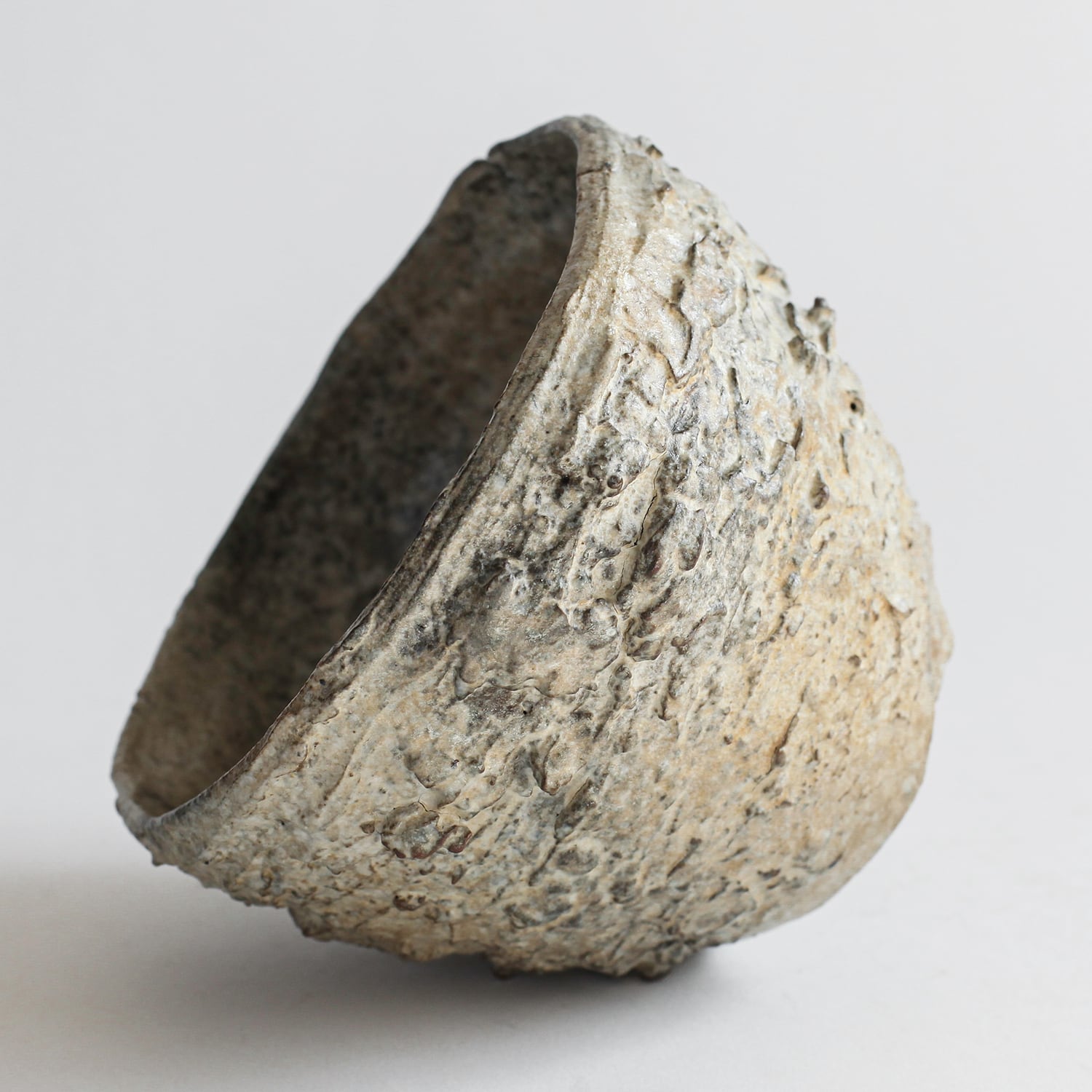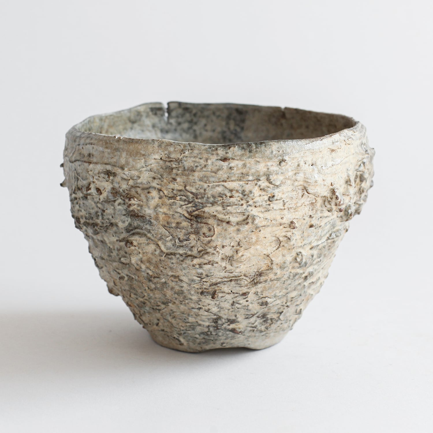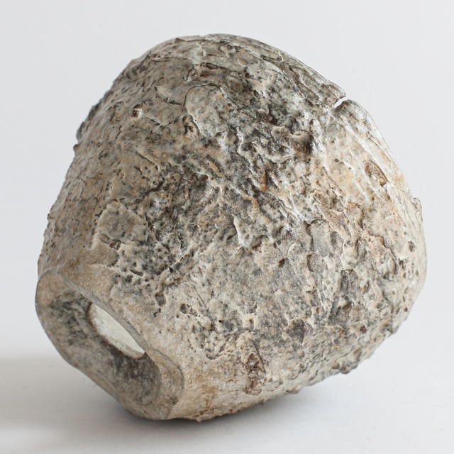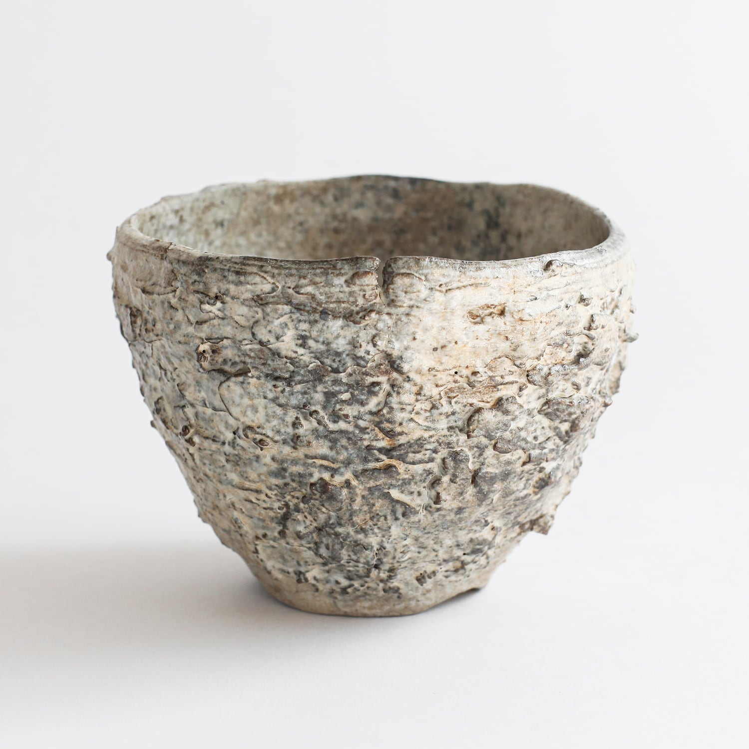 形状も均一ではなく、わずかに歪みや傾きが残されており、手仕事ならではの不均衡さが強く表れています。整いすぎない輪郭と荒れた肌が相まって、無機質でありながらもどこか有機的な存在感を持った器に仕上がっています。