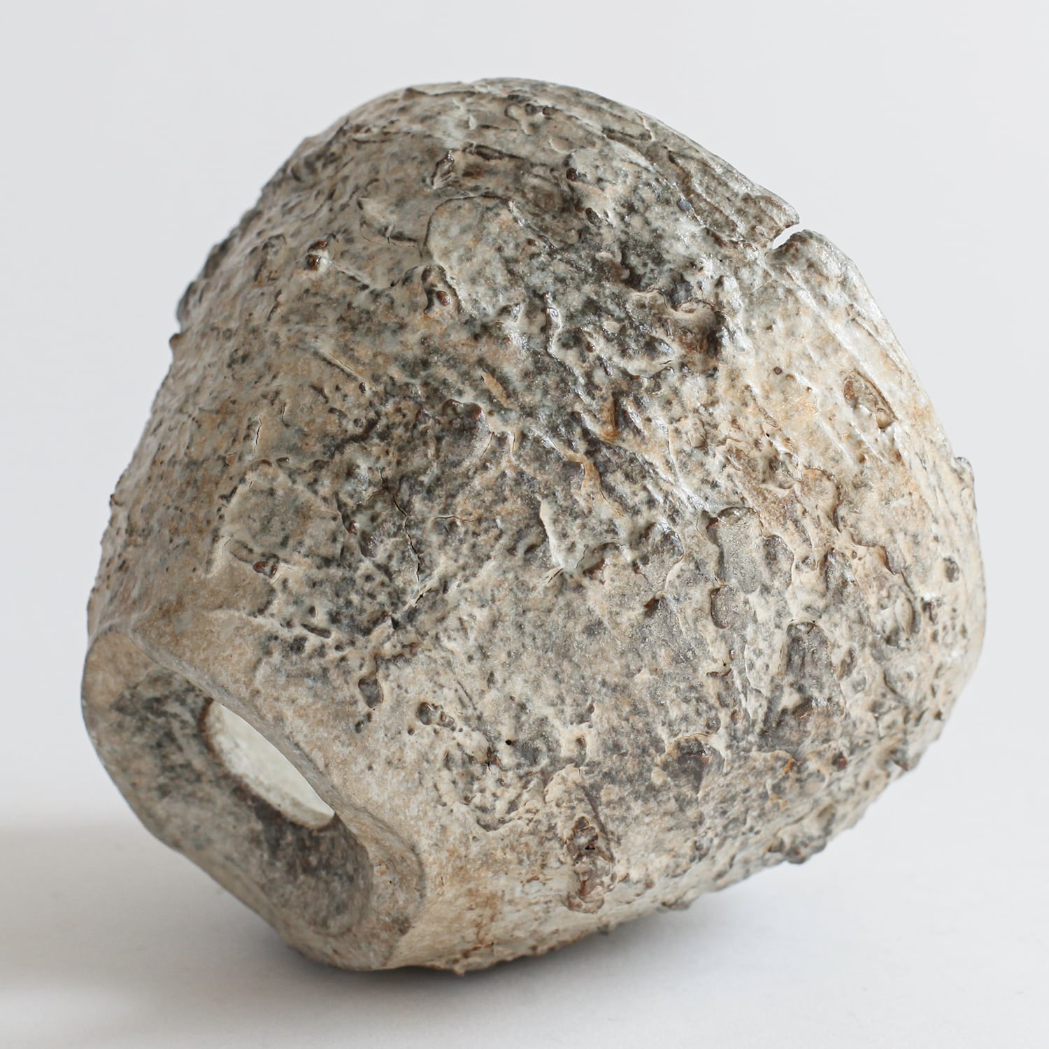 白く粉を吹いたような質感の中に、黒や褐色が滲むことで、経年変化した石や朽ちた壁のような印象も感じられます。