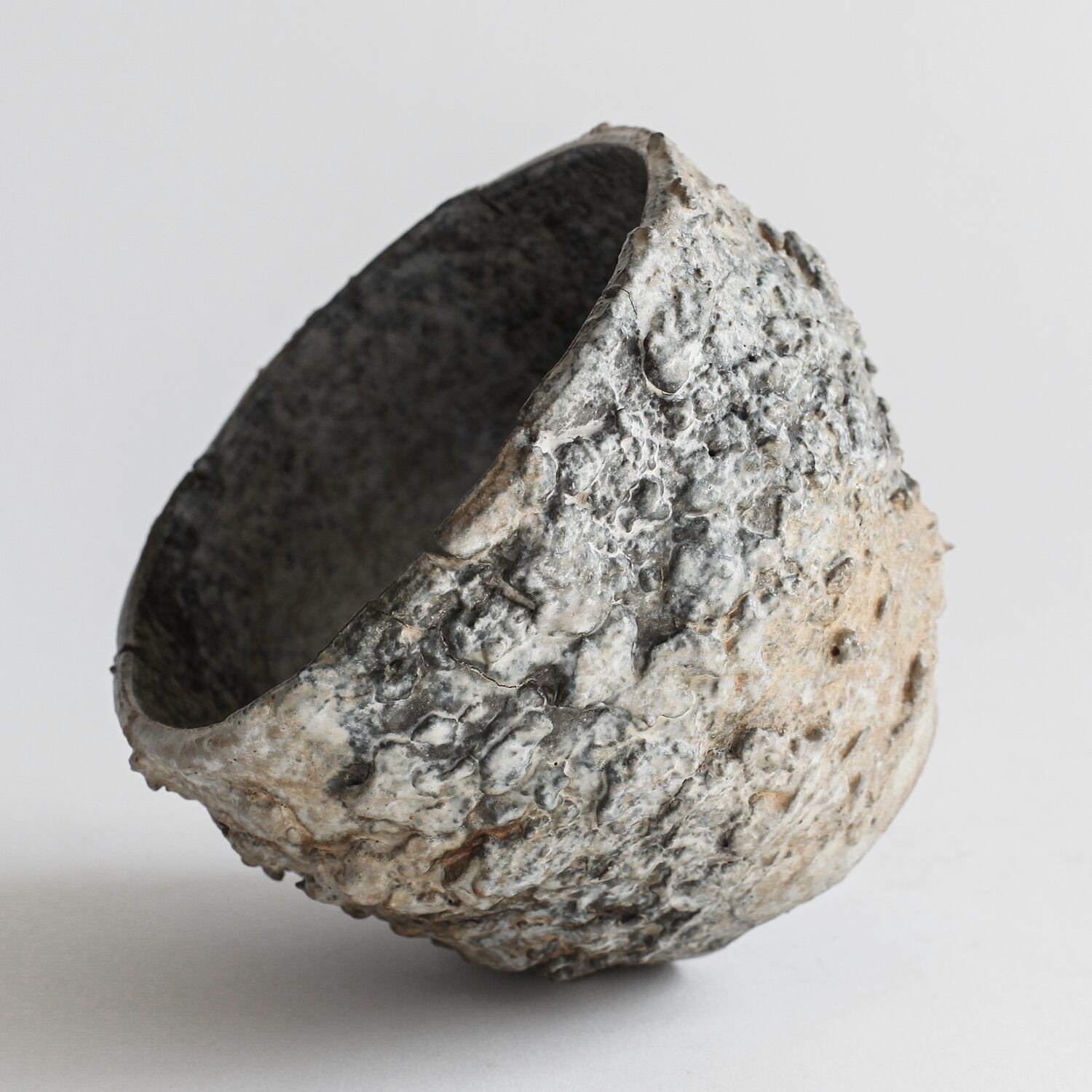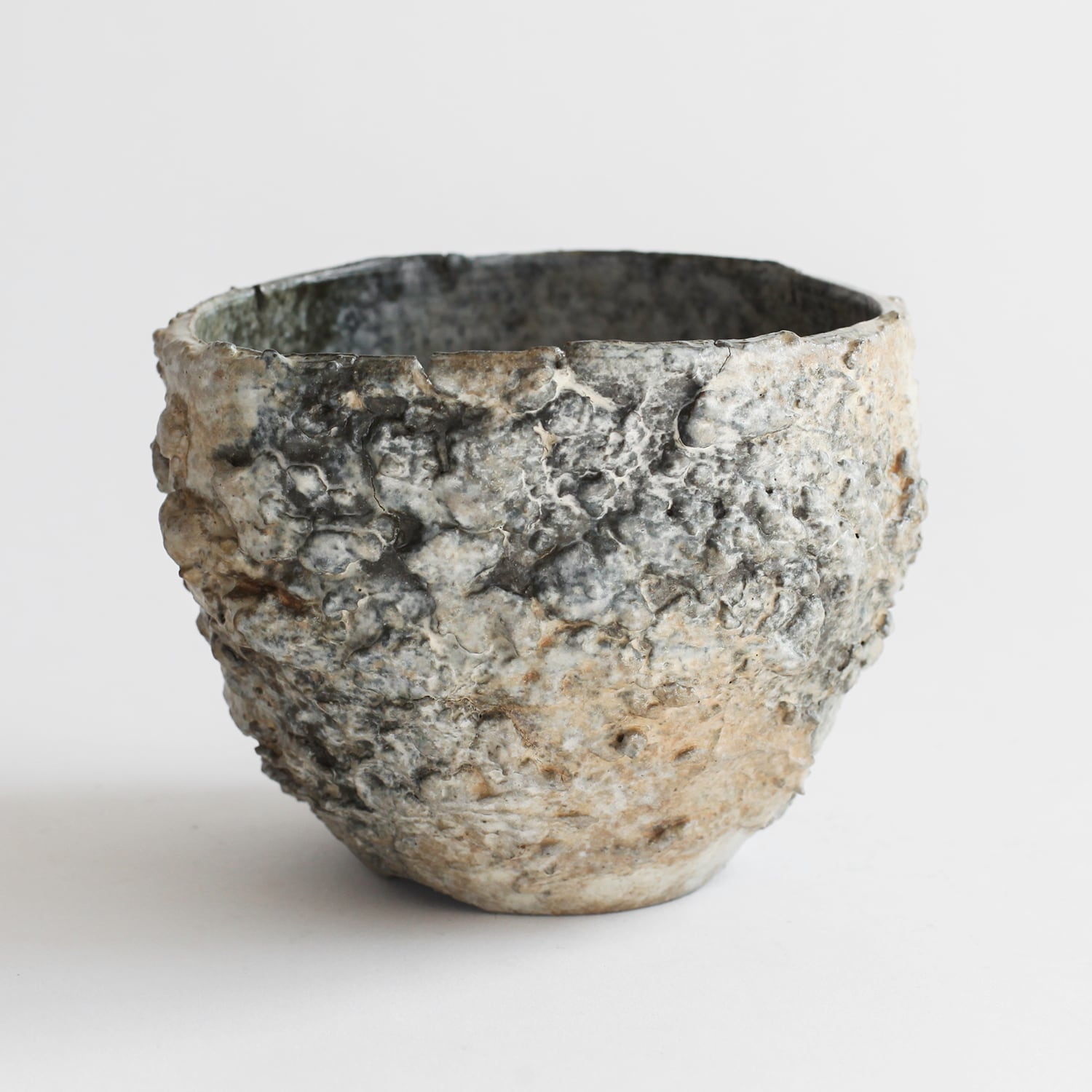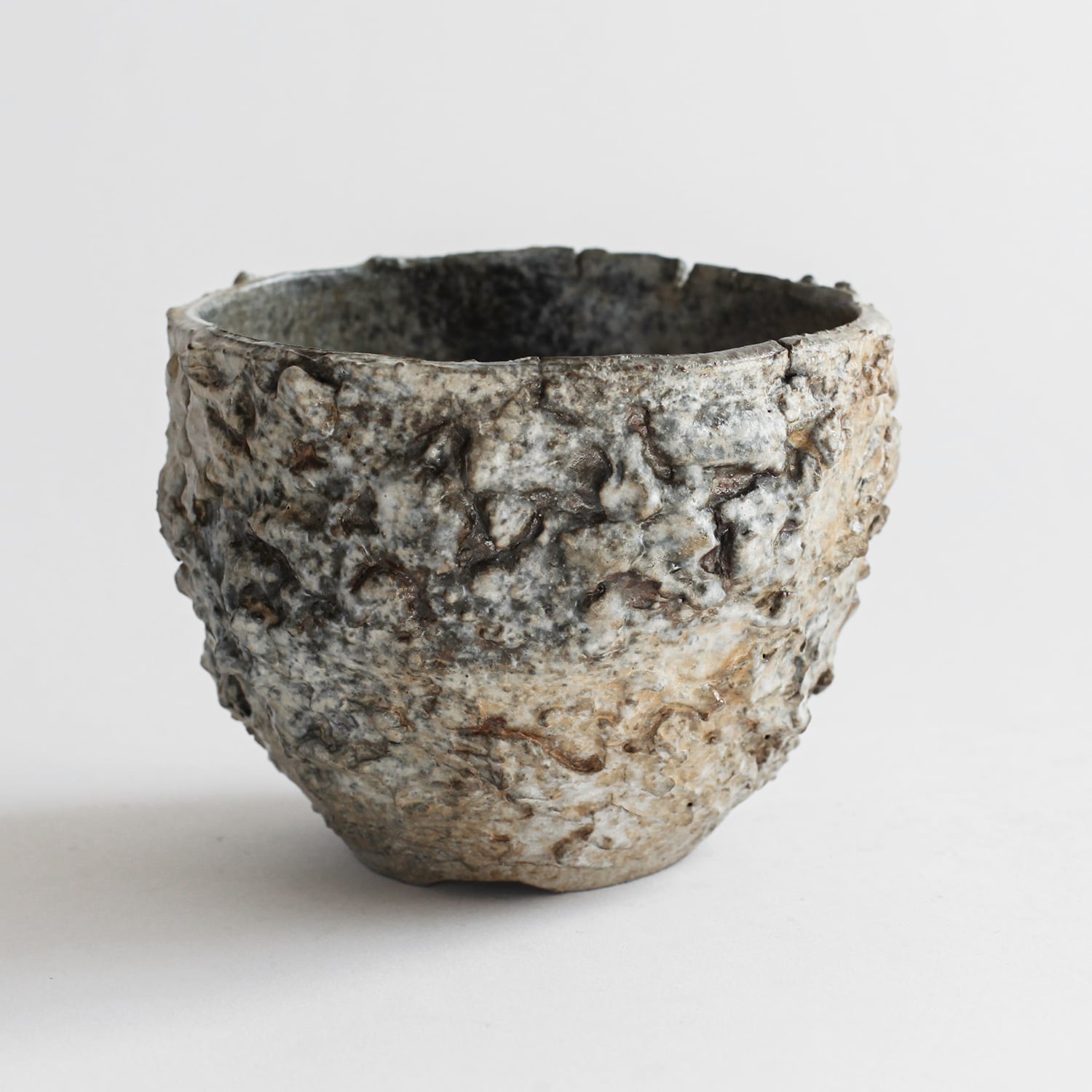 形状も均一ではなく、わずかに歪みや傾きが残されており、手仕事ならではの不均衡さが強く表れています。整いすぎない輪郭と荒れた肌が相まって、無機質でありながらもどこか有機的な存在感を持った器に仕上がっています。