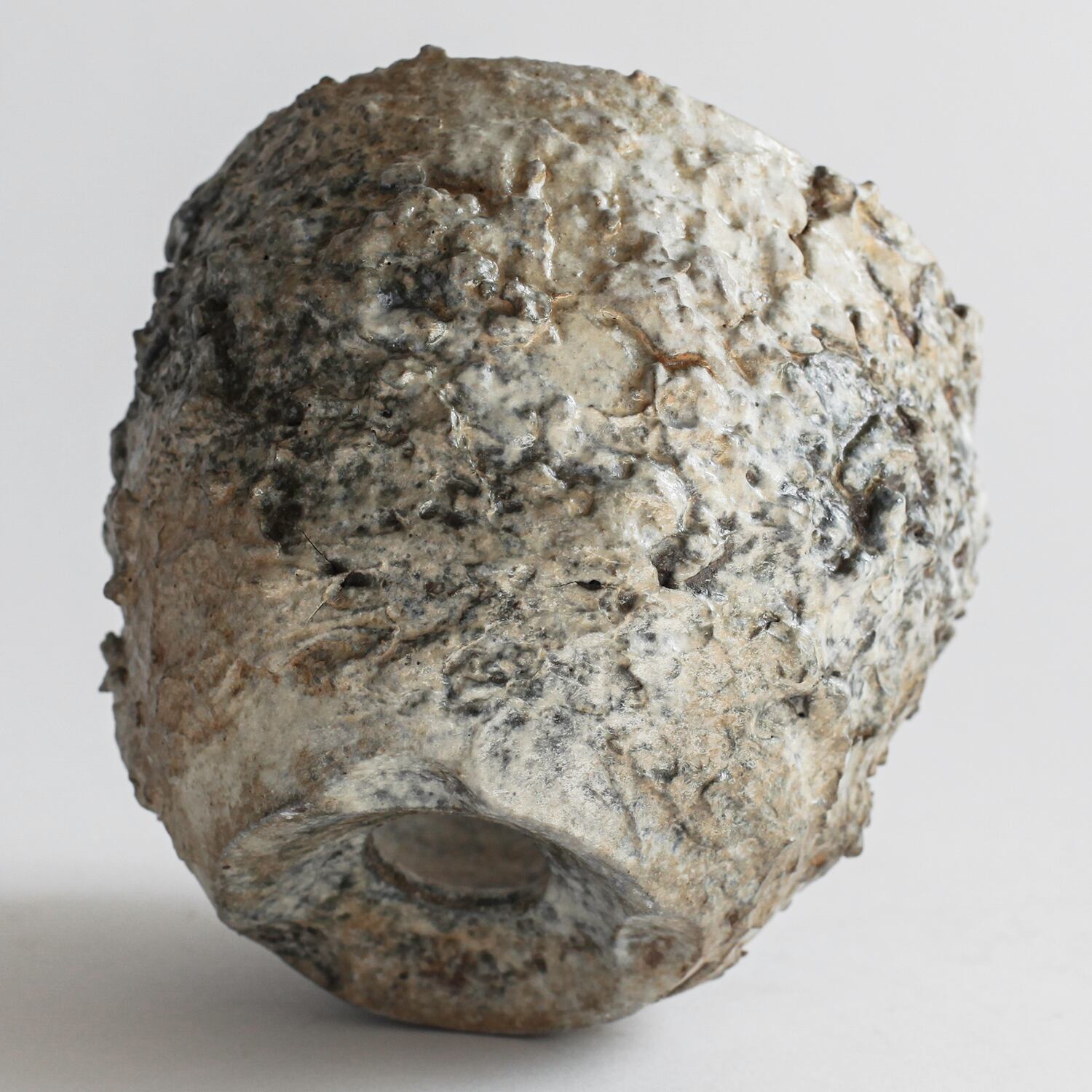 白く粉を吹いたような質感の中に、黒や褐色が滲むことで、経年変化した石や朽ちた壁のような印象も感じられます。