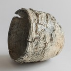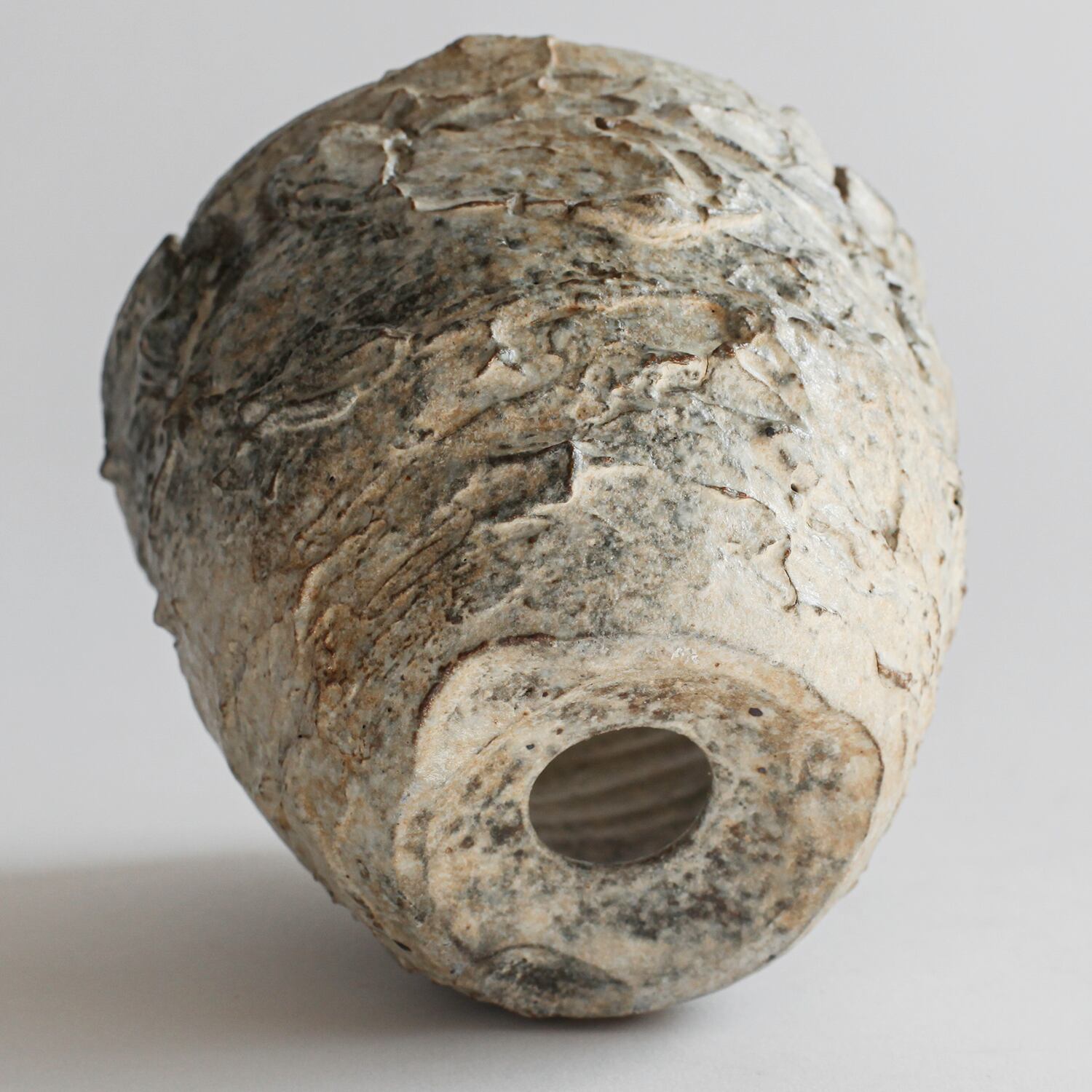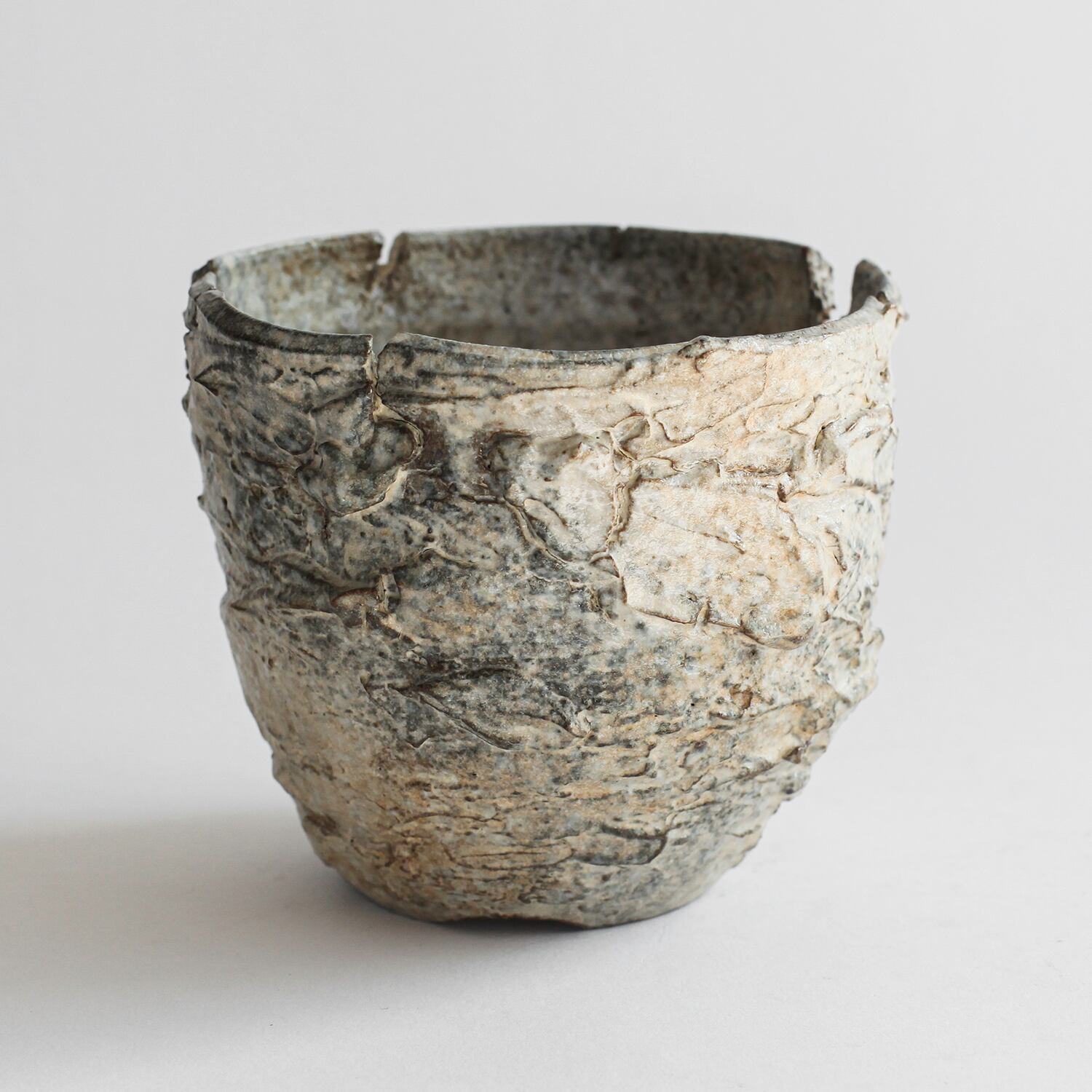 形状も均一ではなく、わずかに歪みや傾きが残されており、手仕事ならではの不均衡さが強く表れています。整いすぎない輪郭と荒れた肌が相まって、無機質でありながらもどこか有機的な存在感を持った器に仕上がっています。