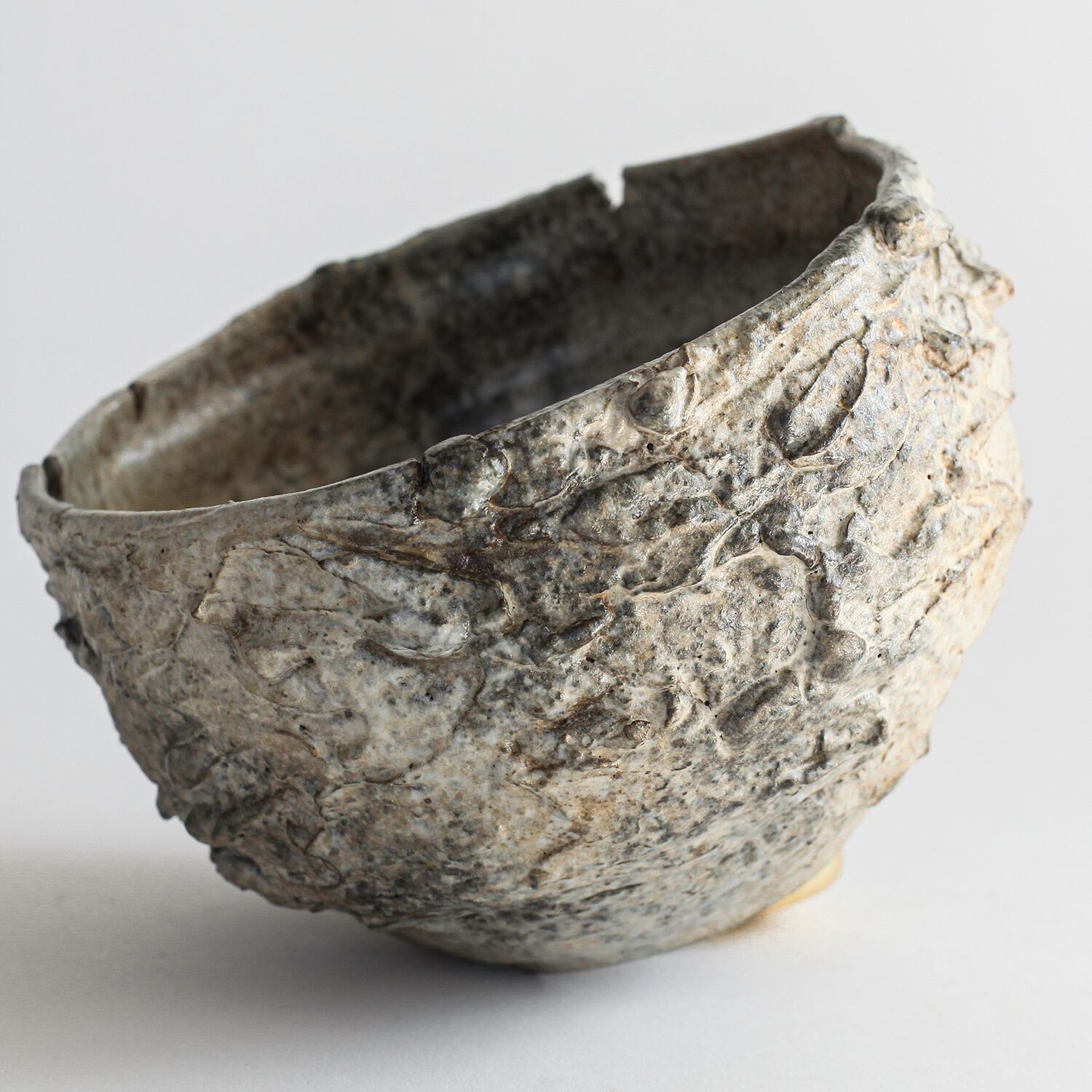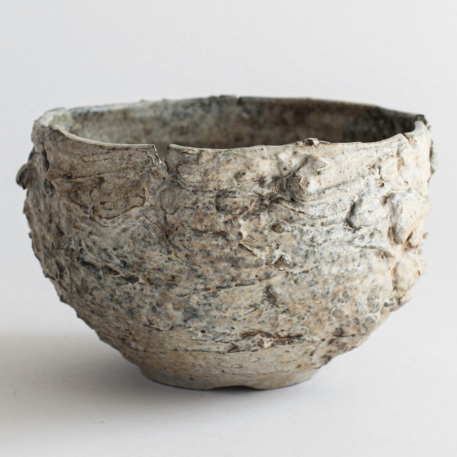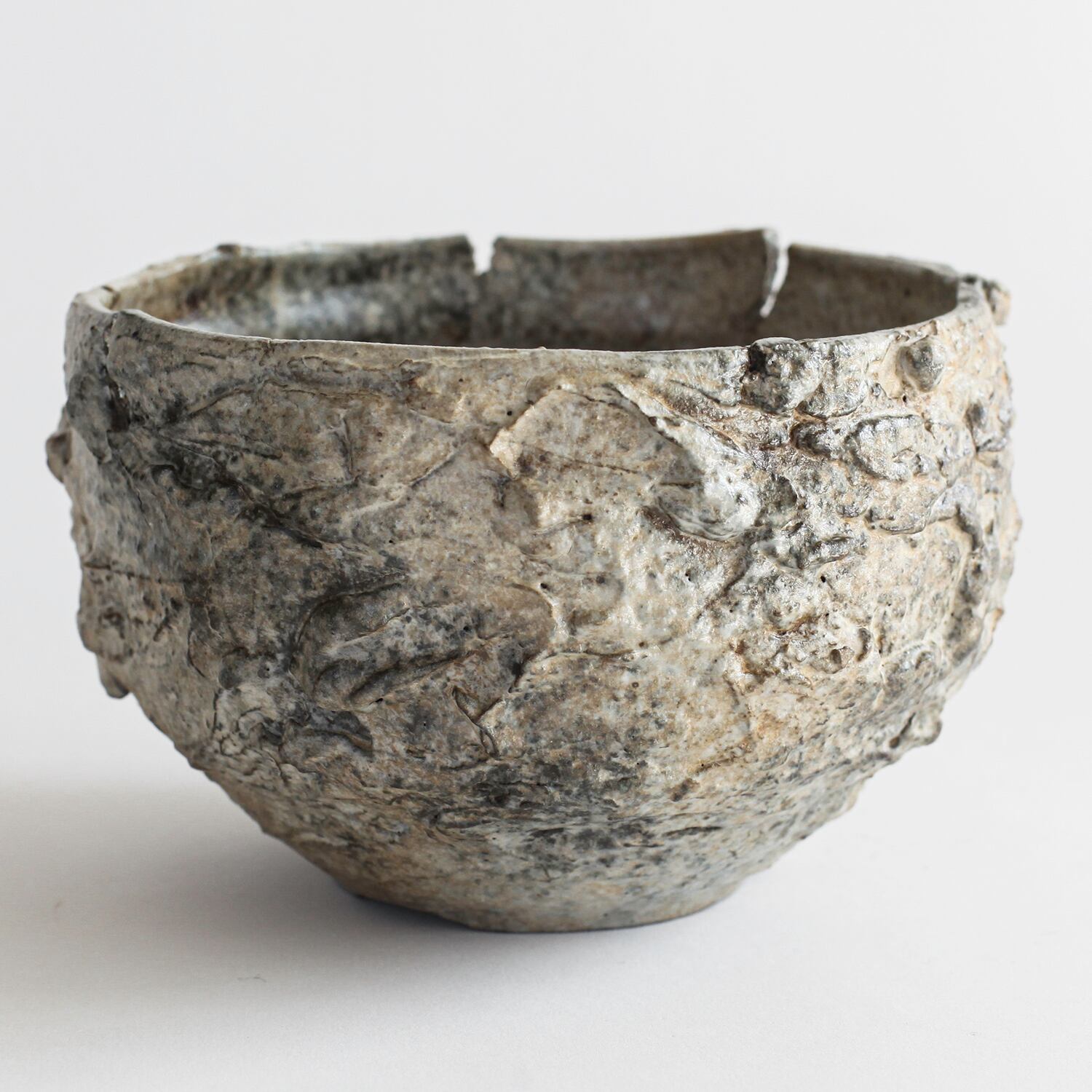 形状も均一ではなく、わずかに歪みや傾きが残されており、手仕事ならではの不均衡さが強く表れています。整いすぎない輪郭と荒れた肌が相まって、無機質でありながらもどこか有機的な存在感を持った器に仕上がっています。