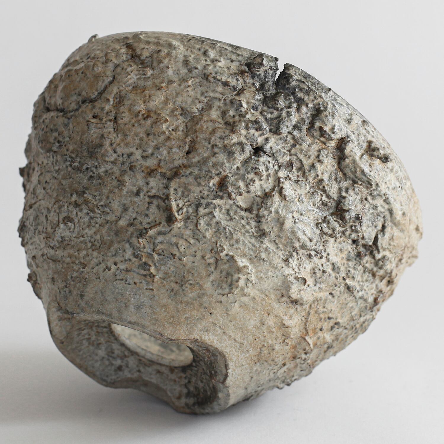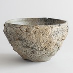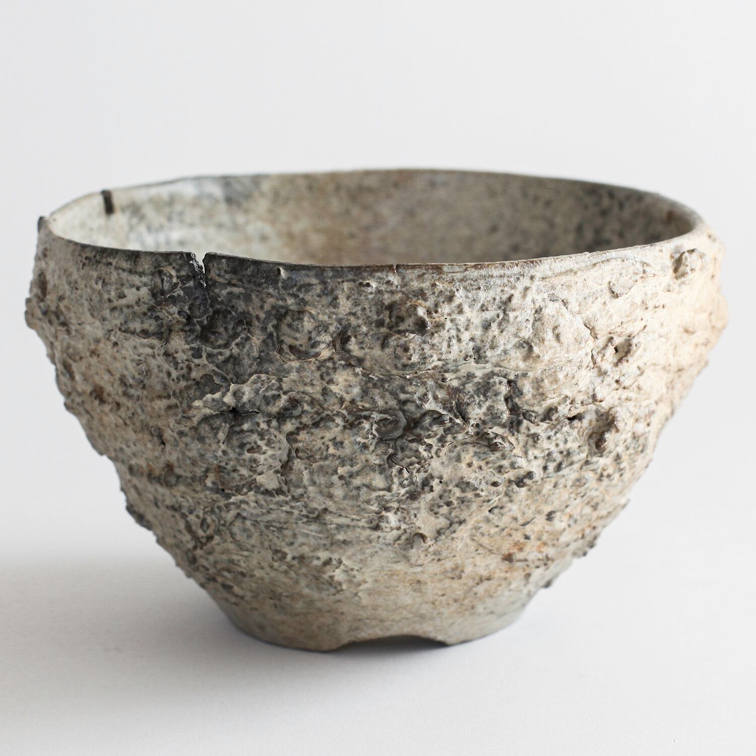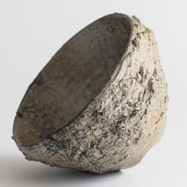形状も均一ではなく、わずかに歪みや傾きが残されており、手仕事ならではの不均衡さが強く表れています。整いすぎない輪郭と荒れた肌が相まって、無機質でありながらもどこか有機的な存在感を持った器に仕上がっています。